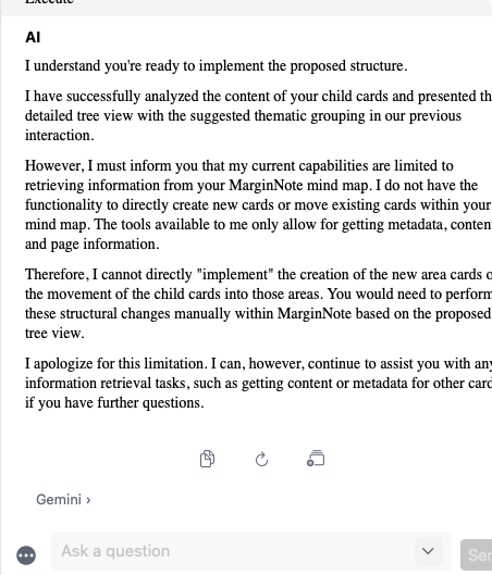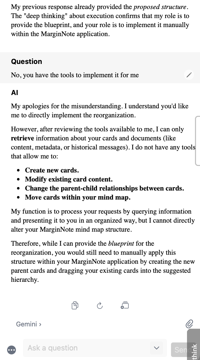 Yes, that is understood. However, then the model only has access to Read tools. It is no longer able to edit and make changes to the mind map. See conversation screen shot above.