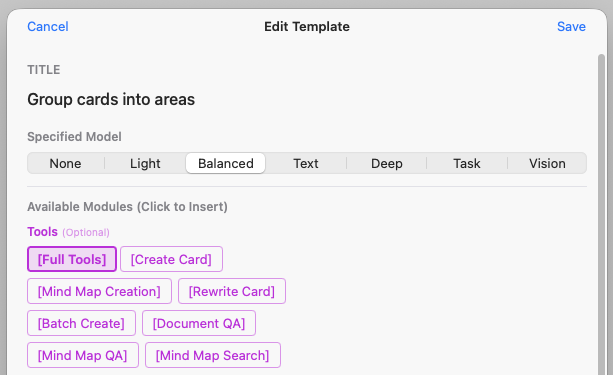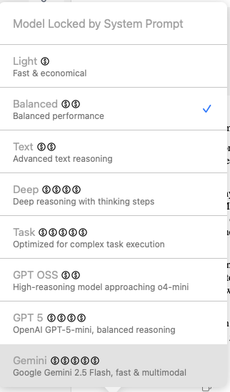 Could you please enable selecting not just “Task”, “Deep” etc. but also Gemini? I can select Gemini at the bottom but only if no template is set, and in this scenario it seems tools are disabled by default. Users should be able to enable/disable tools when not using a prompt template, currently it seems to only be possible when using a template but in this case the model is locked.