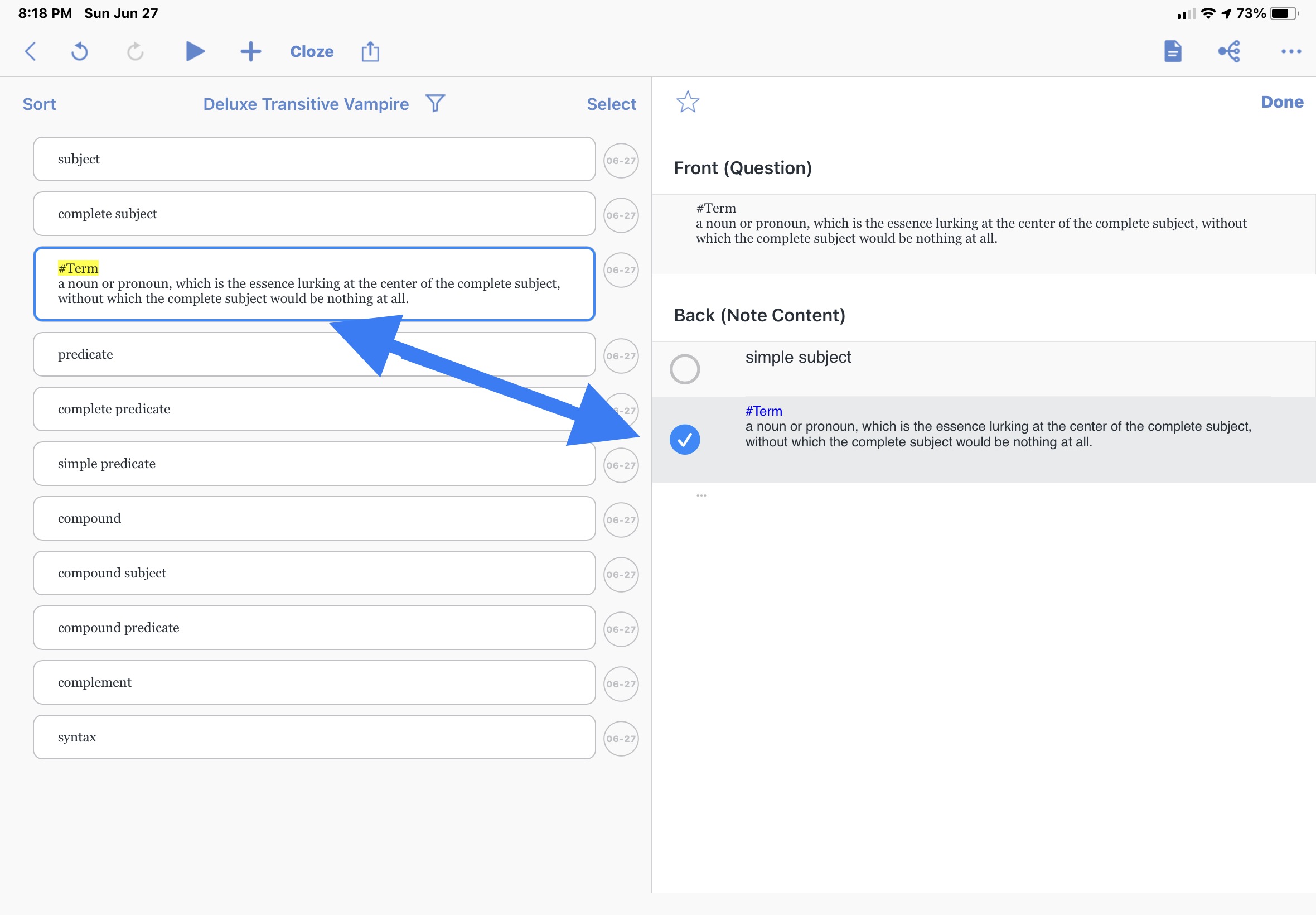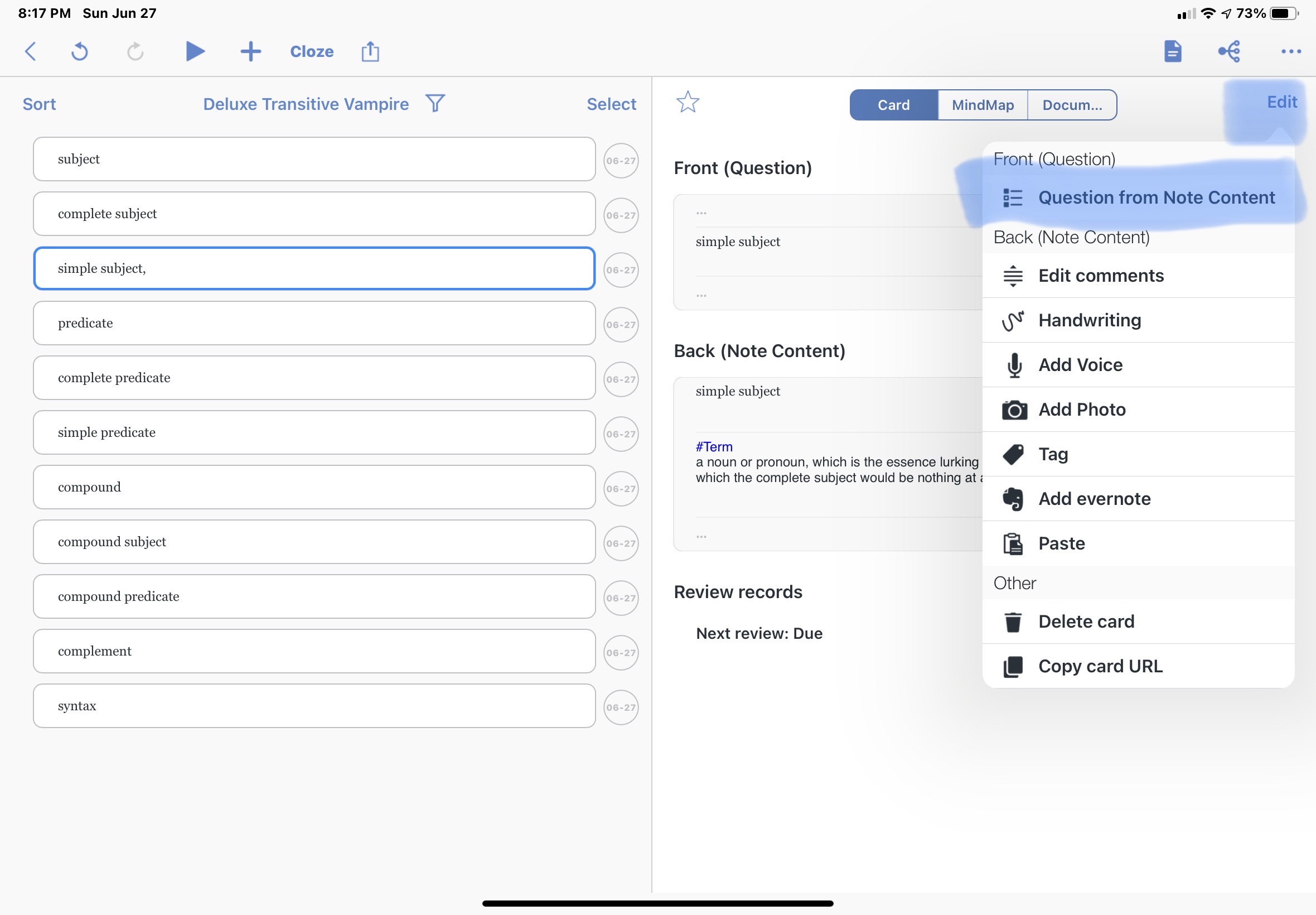 I highlight a word in a book, then paste the dictionary definition as the note. When I am looking at my review cards, it shows me the card title first and I flip to see the note definition. How can I change it so that I see the definitions first on all of them and then flip to reveal the term? I know how to edit one individual card so that the “Front” question is reversed, but how do I change it for ALL my cards?