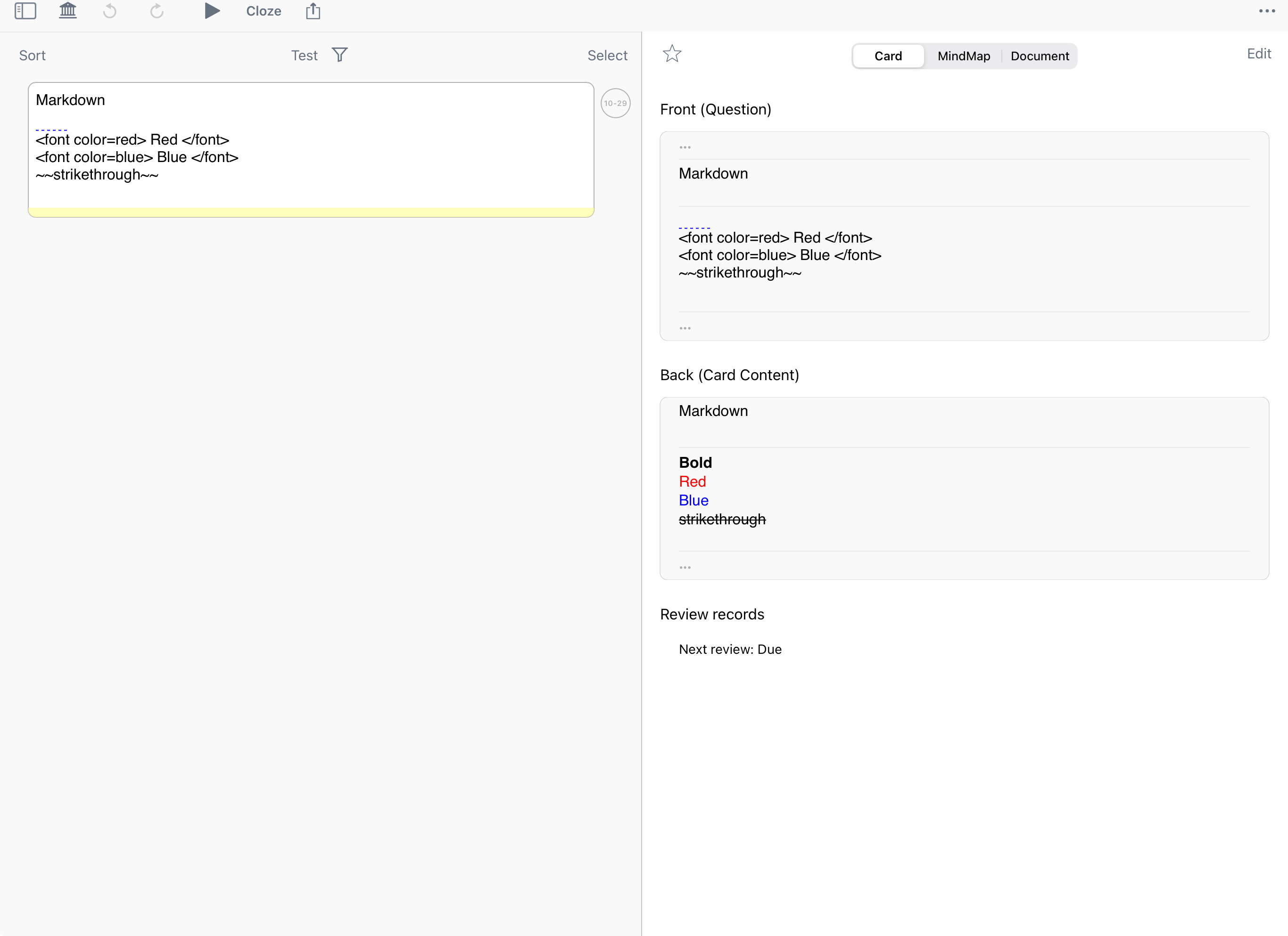 I am experiencing an issue in Review Mode where cards written in Markdown do not render properly. Instead of displaying the formatted content, the card shows the raw code.