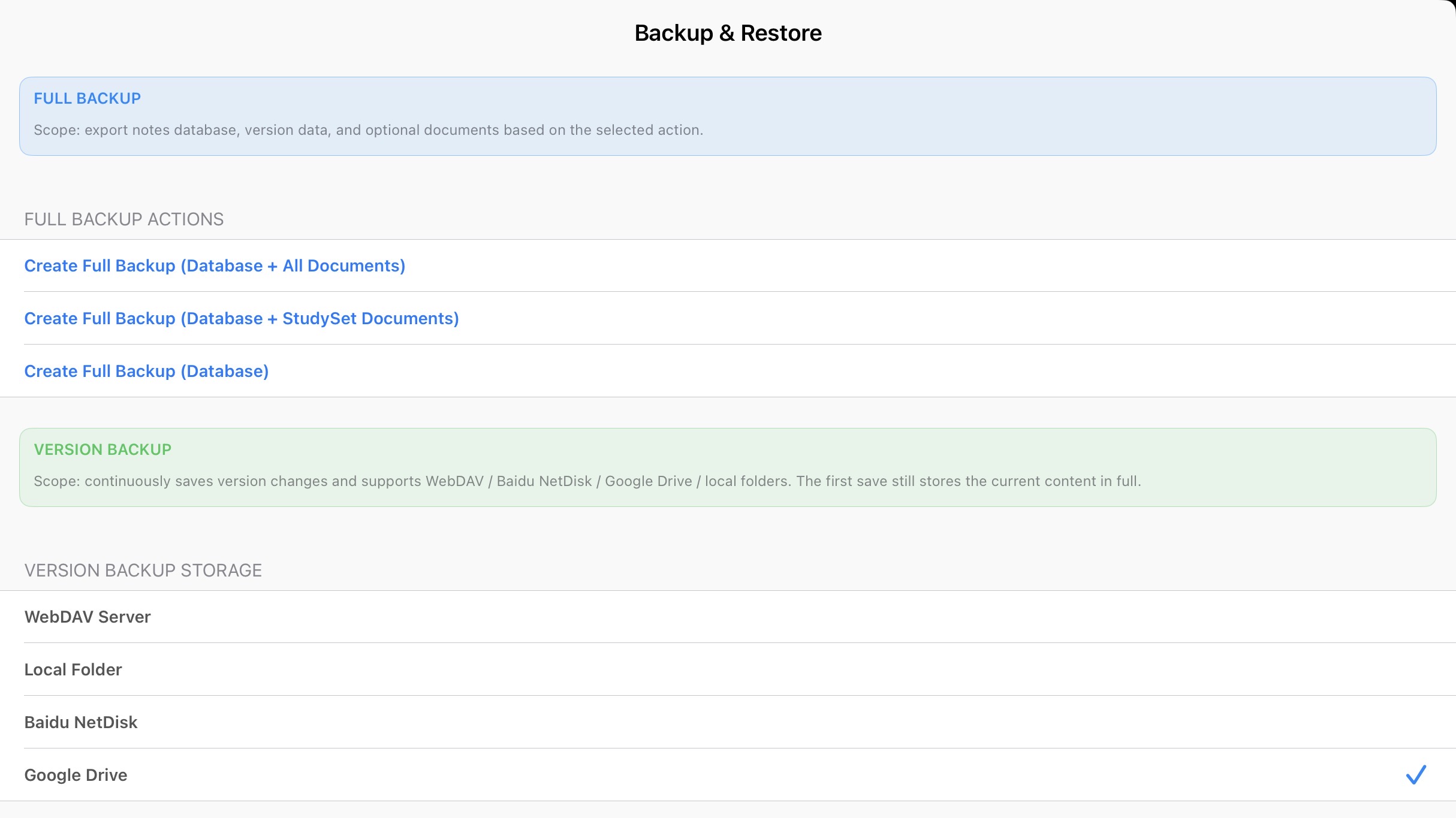 Hi there. I really appreciate the latest update that added versioning backups, mainly because the old “full backup” was 56GB on my iPad so I literally cannot make a backup! It won’t even let me save something so large!
