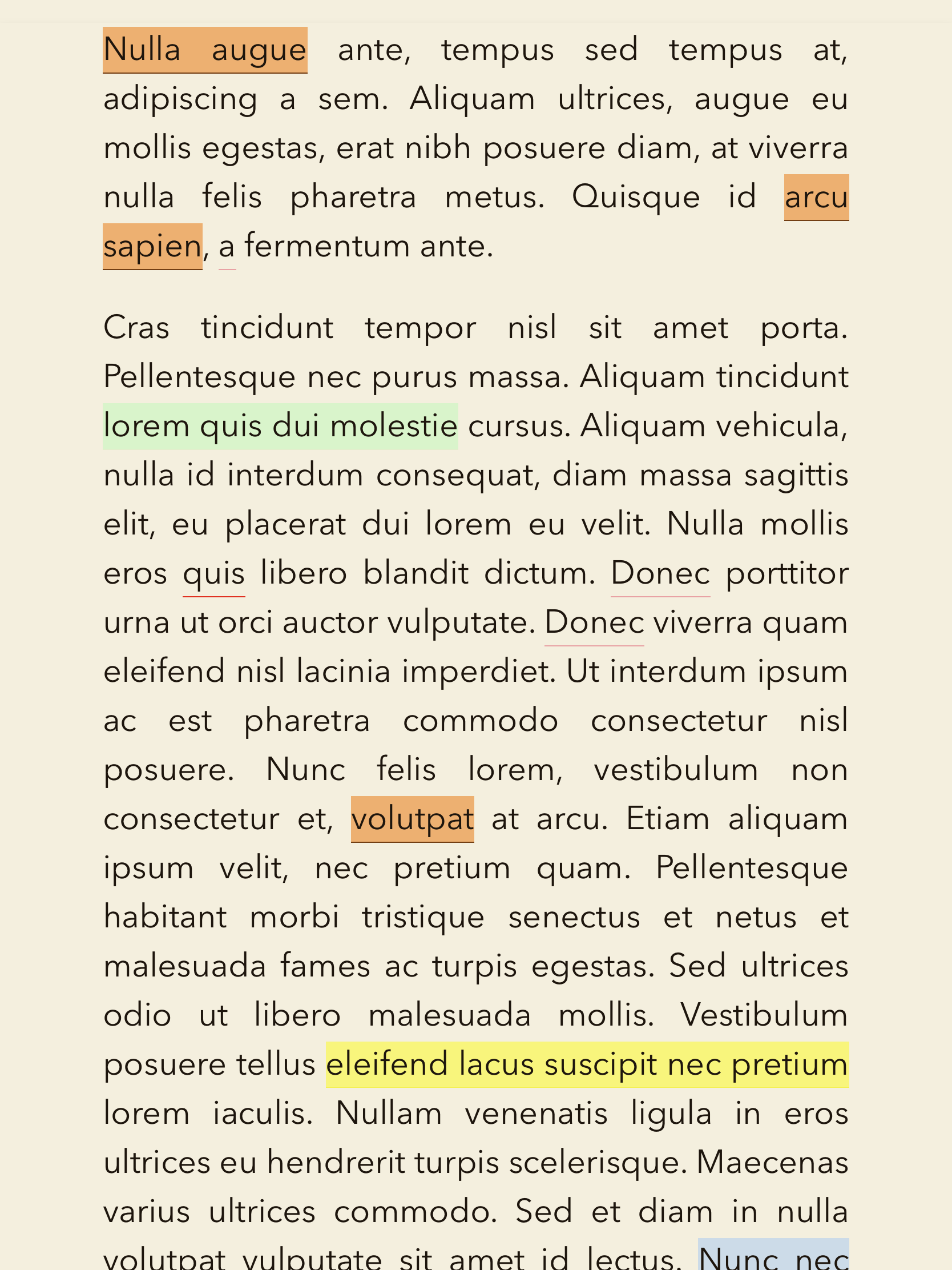 Image 3. This is a screenshot of an equally heavily highlighted page. I haven’t added any notes yet, so there are no >> angle brackets. Do you see how much cleaner and more legible it appears? By their nature, the highlights do affect readability, but here they are less intrusive and don’t affect the layout of the paragraphs. I think perhaps just abolishing brackets altogether in favor of an “Expand” button in the main bar would be the best approach. Image 3
