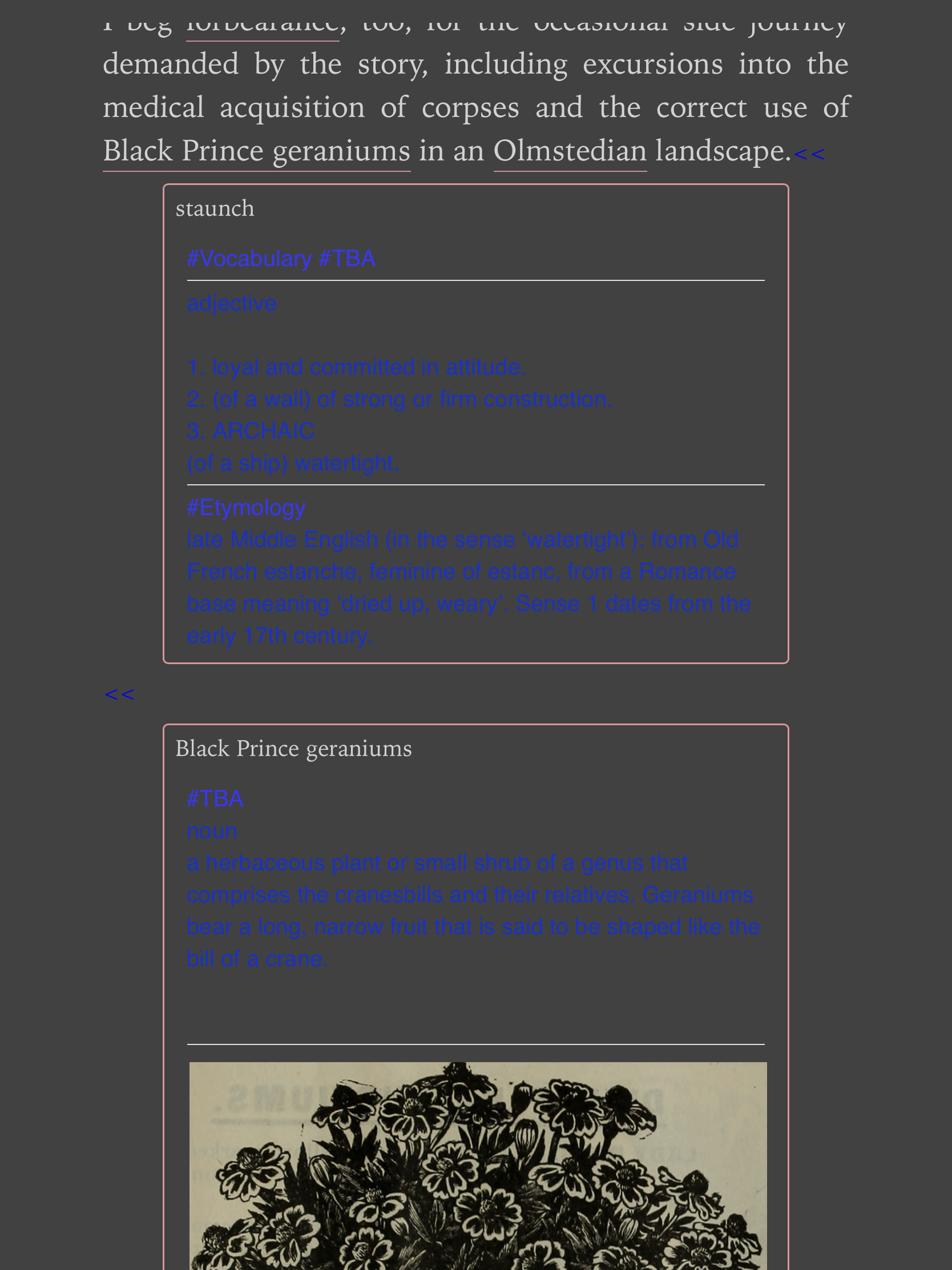 In-text notes when expanded are presented in dark blue text. It’s difficult to see when reading in “Dark Mode”.
